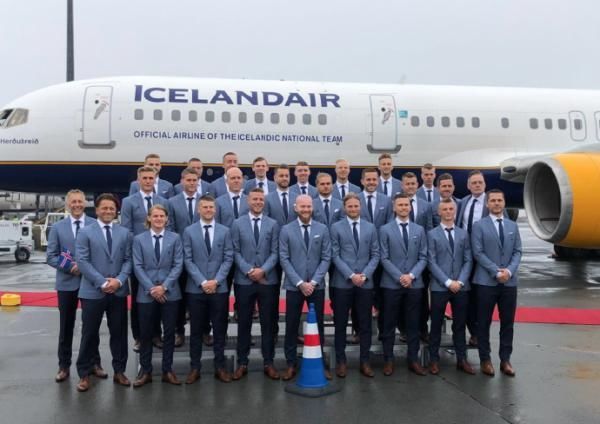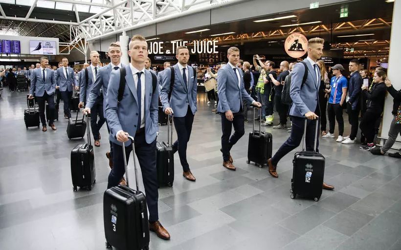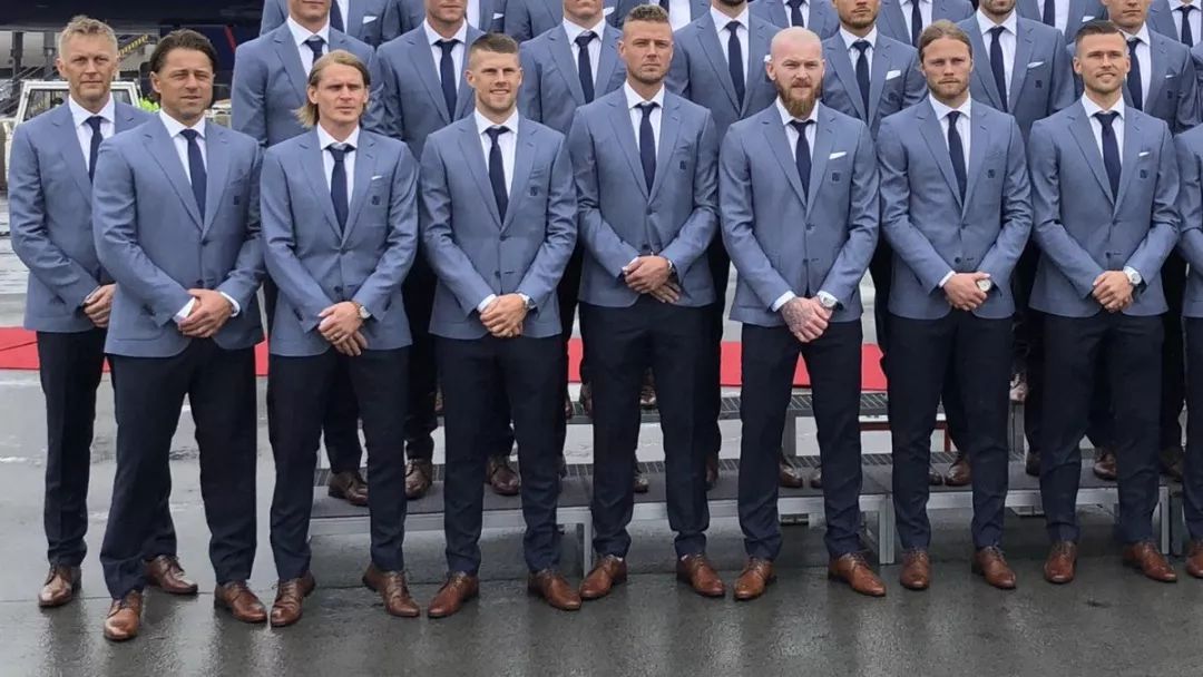 冰島隊是唯一一個沒有穿套裝,而選擇淺藍單西+深藍褲子的球隊,搭配棕色牛津鞋,全隊站在一起看起來干凈清爽,雖褲子稍長,但瑕不掩瑜。